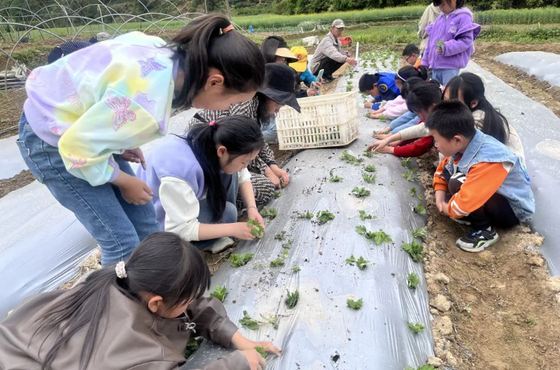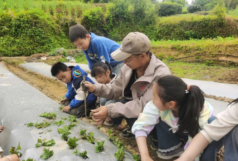在铺覆着银色地膜的田垄间,孩子们化身“小农匠”,分工协作完成移栽。一组手持竹签扎出整齐的定植孔,另一组小心翼翼传递菊苗,最后大家合力将幼苗植入土中,覆土压实。程付强全程指导。“薄膜能保温保湿,株距20厘米才能让根系充分生长。”尽管动作稚嫩,但孩子们神情专注,田垄间不时传来“轻点放苗”“土要盖紧”的互相提醒声。